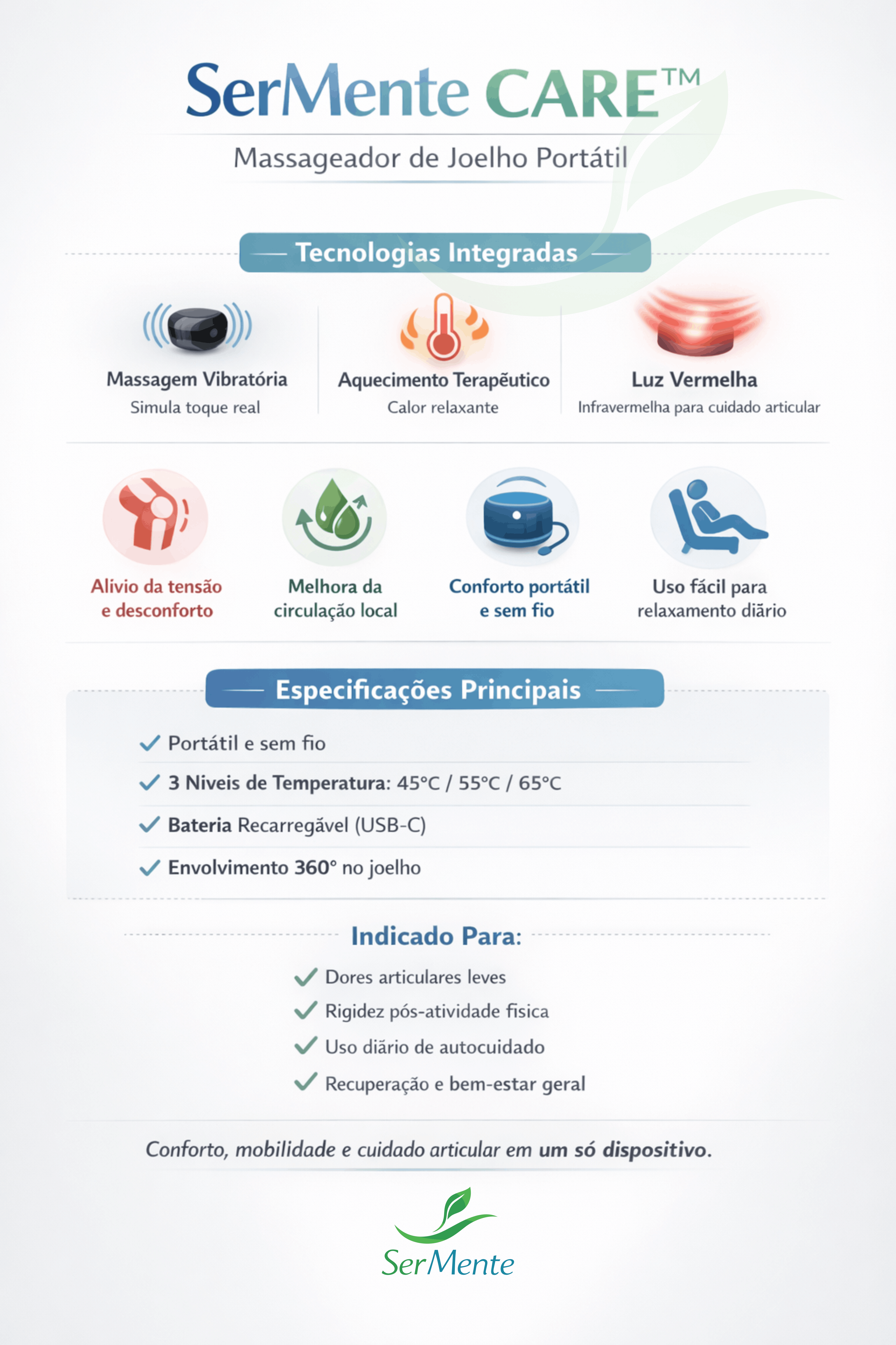 O SerMente CARE™ – Massageador de Joelho foi desenvolvido para oferecer alívio, conforto e cuidado completo das articulações, unindo tecnologia de massagem vibratória, aquecimento terapêutico e luz vermelha em um único dispositivo portátil.