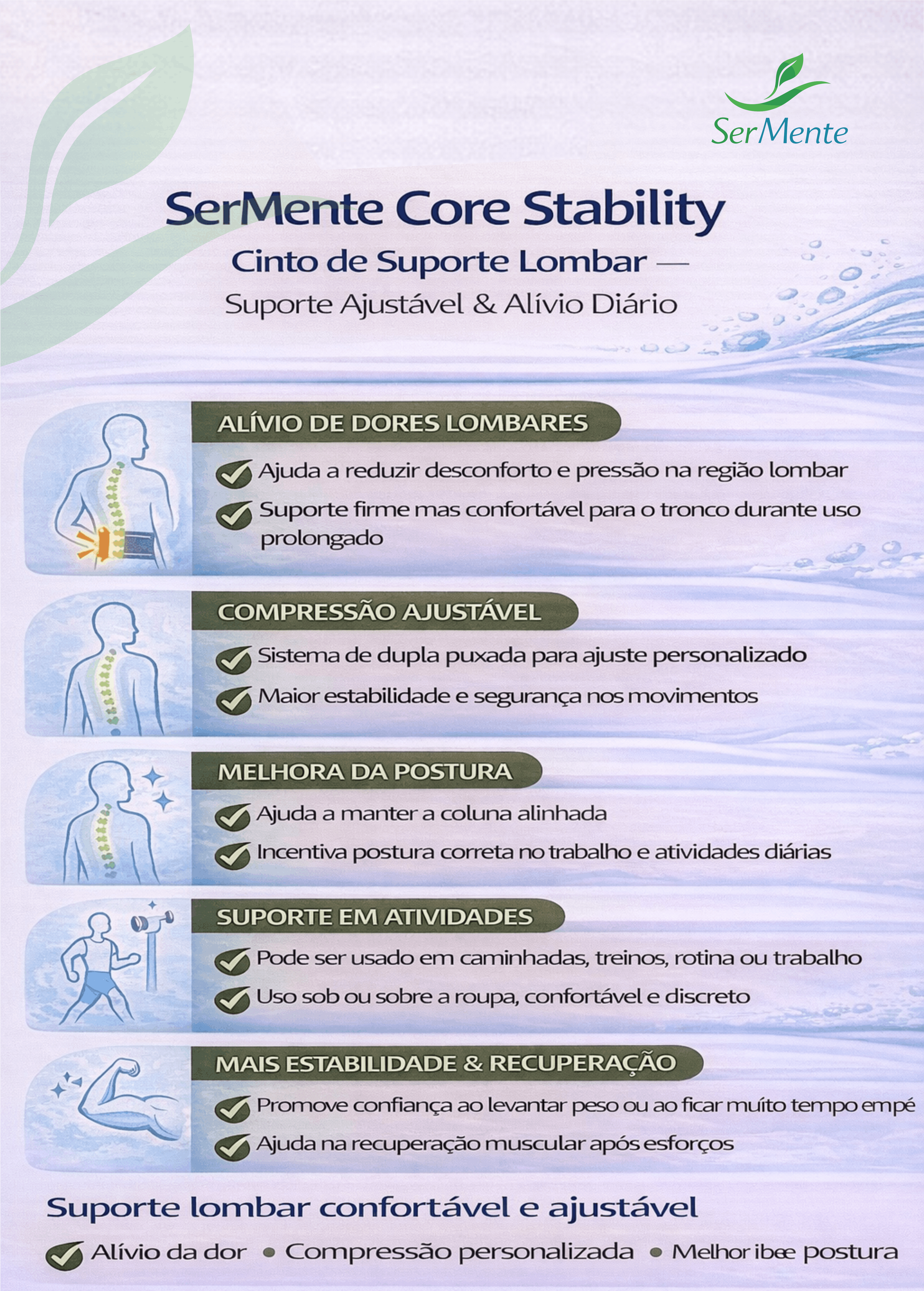O SerMente CORE STABILITY™ foi desenvolvido para oferecer suporte lombar avançado, alívio da dor e proteção da coluna durante atividades do dia a dia, trabalho pesado ou treinos. Seu sistema de dupla puxada com compressão ajustável garante ajuste preciso, estabilidade e conforto prolongado.
