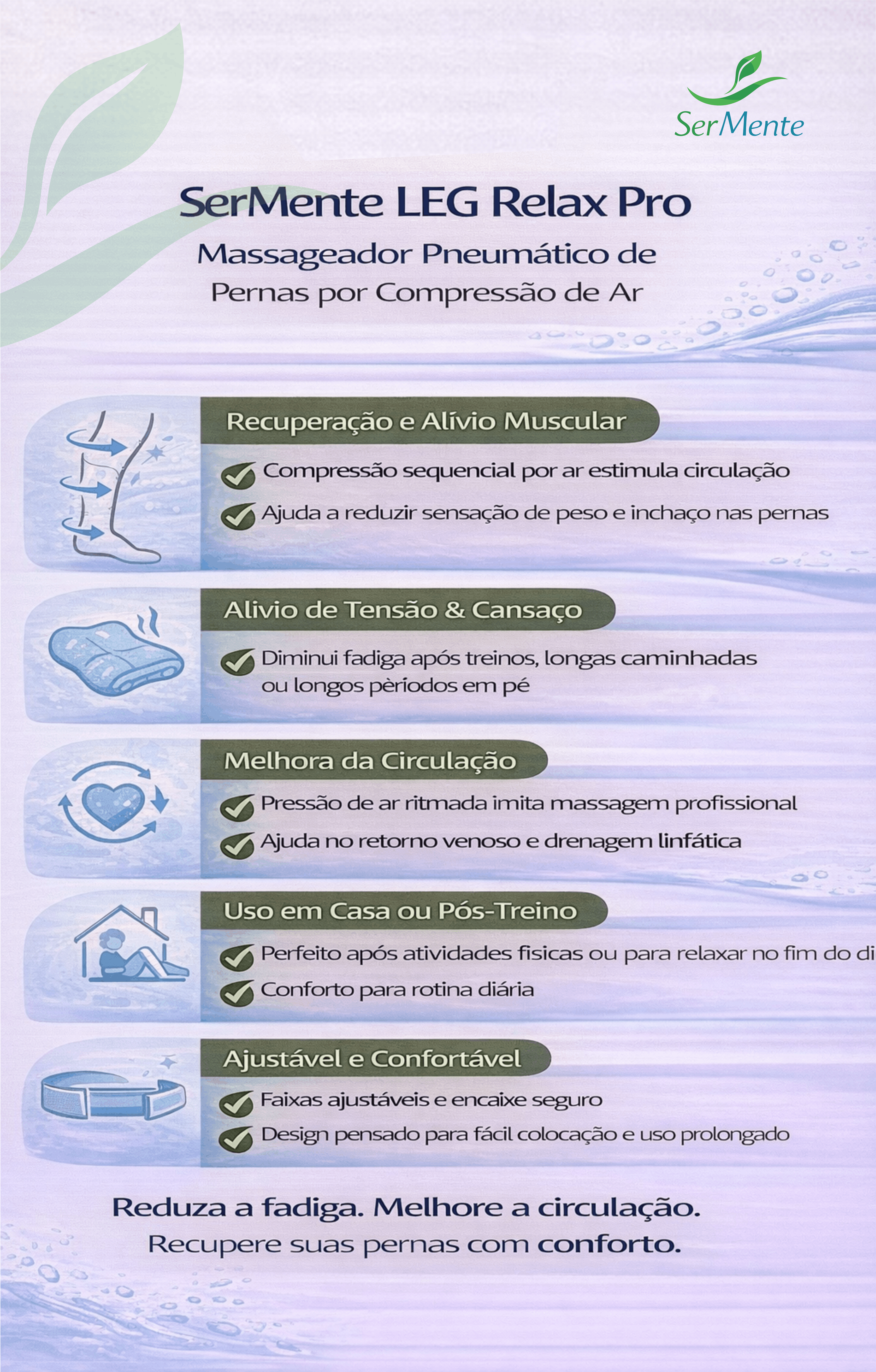 O SerMente LEG RELAX PRO™ foi desenvolvido para proporcionar alívio profundo, relaxamento muscular e sensação de descanso imediato para pernas cansadas e sobrecarregadas. Utilizando compressão pneumática inteligente, ele simula a massagem das mãos humanas, ajudando a liberar tensões, estimular a circulação e reduzir o cansaço diário.
