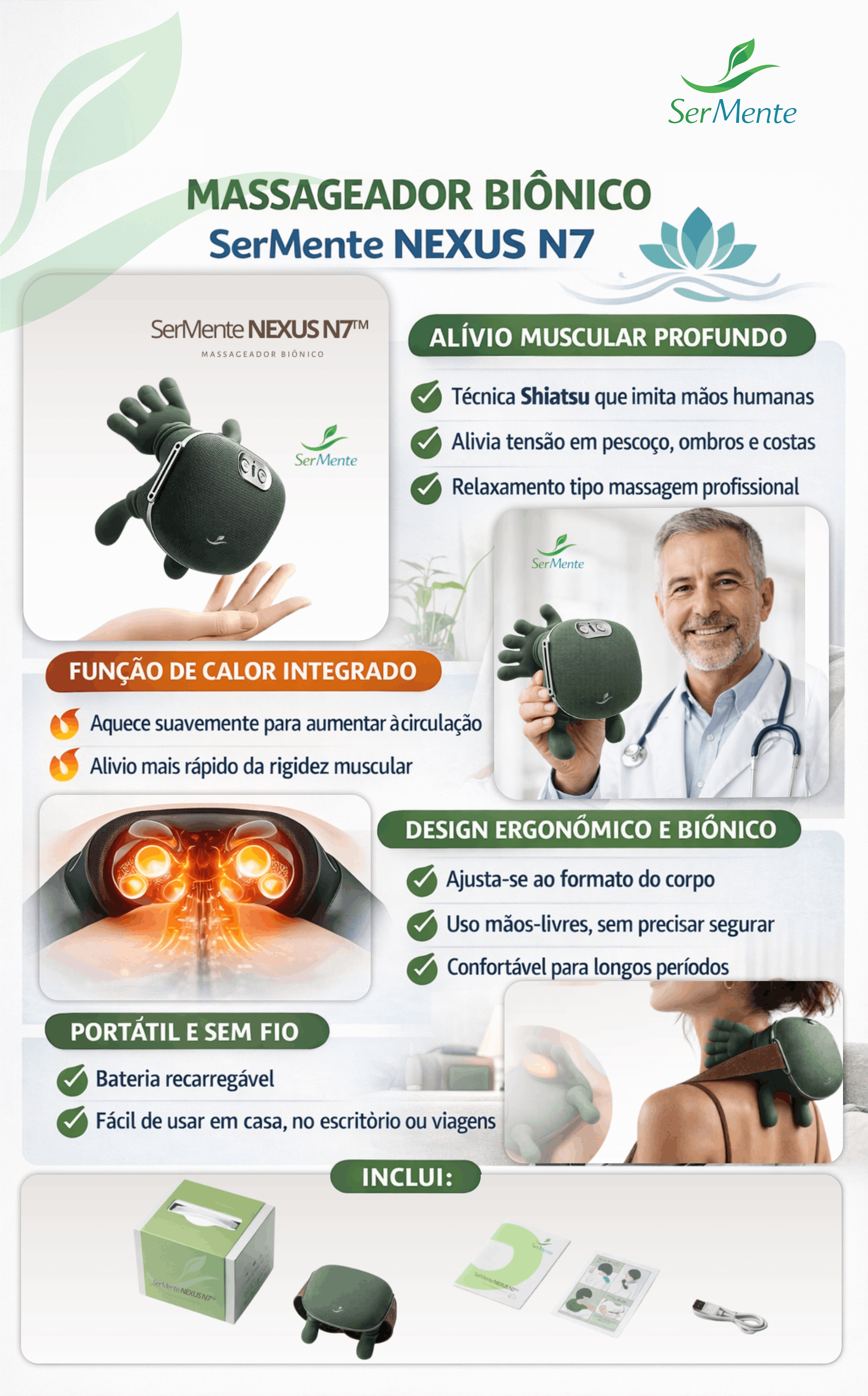 O SerMente NEXUS N7™ é um massageador biônico de última geração desenvolvido para quem sofre com tensão no pescoço, ombros rígidos, dores musculares e estresse acumulado.