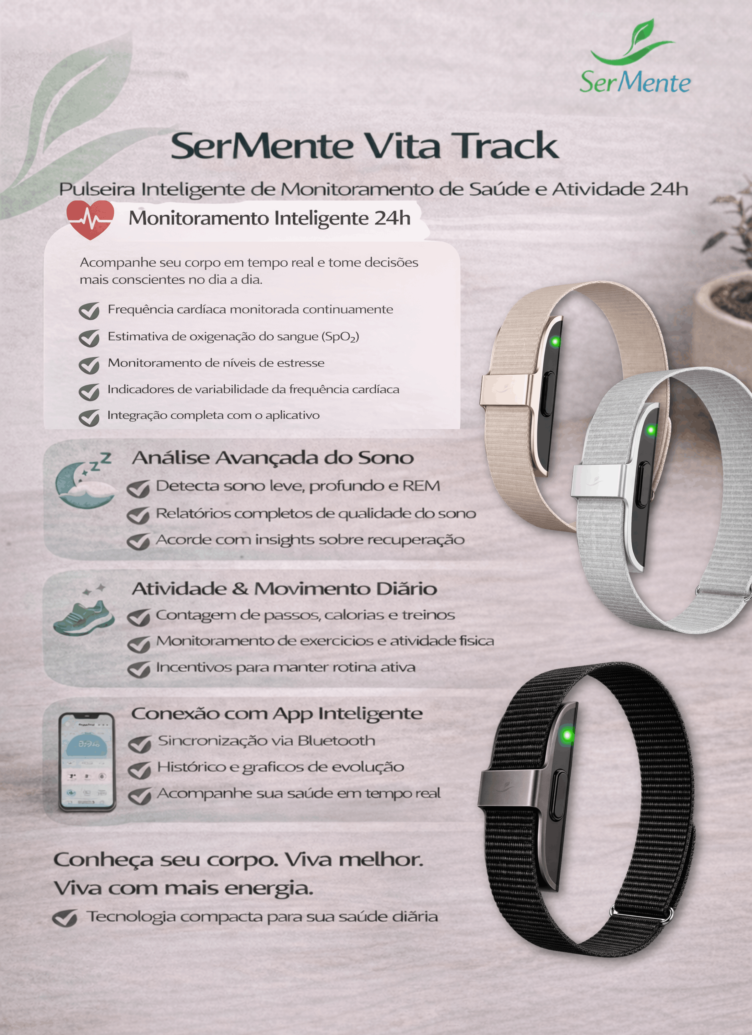 A SerMente VITA TRACK™️ foi criada para transformar sua rotina em uma jornada de autocuidado inteligente. Compacta, elegante e funcional, ela monitora seus indicadores corporais, atividades físicas e qualidade do sono ao longo do dia — tudo de forma automática.